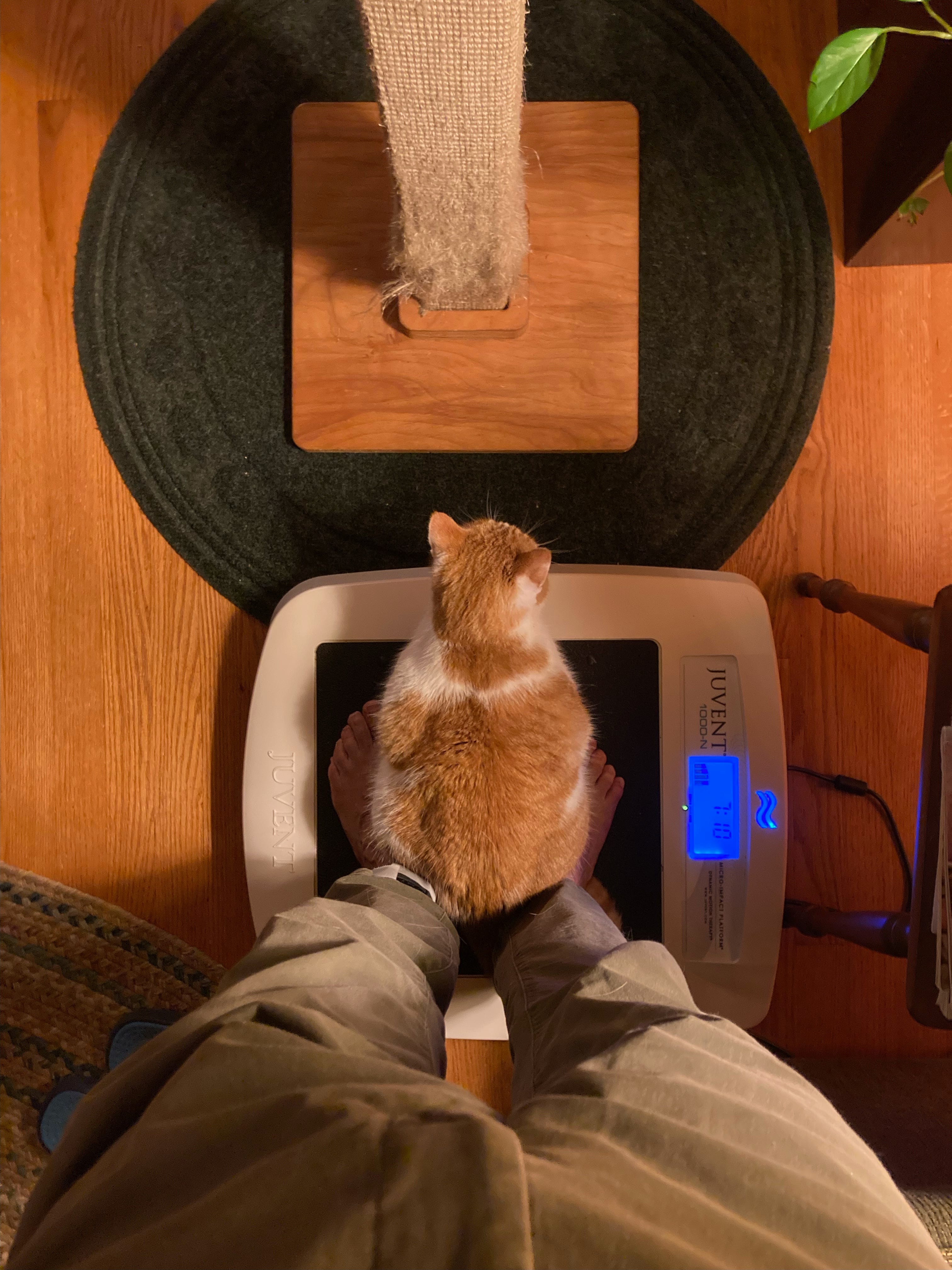 Typically our black cat Charlotte will jump onto the sofa arm to get pet by whoever is on the Juvent. Our orange and white cat Renny will get on the Juvent for a while too, and share the ride. There was one night when he let me hold him in my arms for the entire twenty minutes. Clearly he has given his seal of approval. Some nights I’ll pull up the ironing board and press some shirts while I’m on the Juvent. Sometimes I’ll watch the first part of a movie while I’m on it. Last weekend I made a squash soup from scratch from the Juvent. You get the idea. It’s possible to make good use of your time while getting the health benefits.