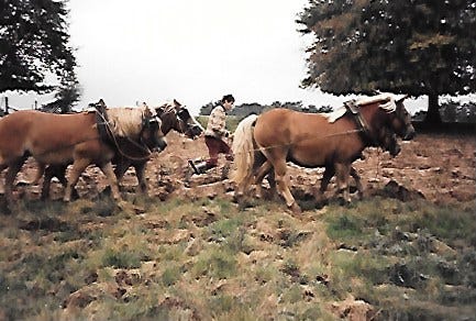 My first assignment upon arrival was cleaning the leather collars for the draft horses. These horses were in fact double ponies called Haflingers, which hailed from the Swiss mountains. They are beautiful and intelligent creatures who are sturdier than horses and love to work. Fieldwork at Le Couteil, whether it was spreading manure, plowing, or harvesting hay, was done with the team hitched up four abreast or two and two, depending upon the task. There was also an enormous Percheron on the farm which was used more for pleasure riding in a carriage.