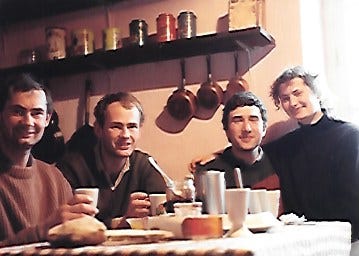 Cleaning out the cow stalls, bringing hay to the cows in the pasture, and generally working about the farm left me in the leanest, meanest state of physical strength I have been before or since. The biggest meal of the day was lunch, and Brigitte would create the most magnificent dishes from the simple pallette of eggs, farm cheese, leeks, potatoes, butter, onions and the range of meat and poultry grown on the farm. She would also make mouthwatering tarts from the apples kept in cold storage. Almost everything, including the wheat for the flour used to bake our bread, was grown on the farm.