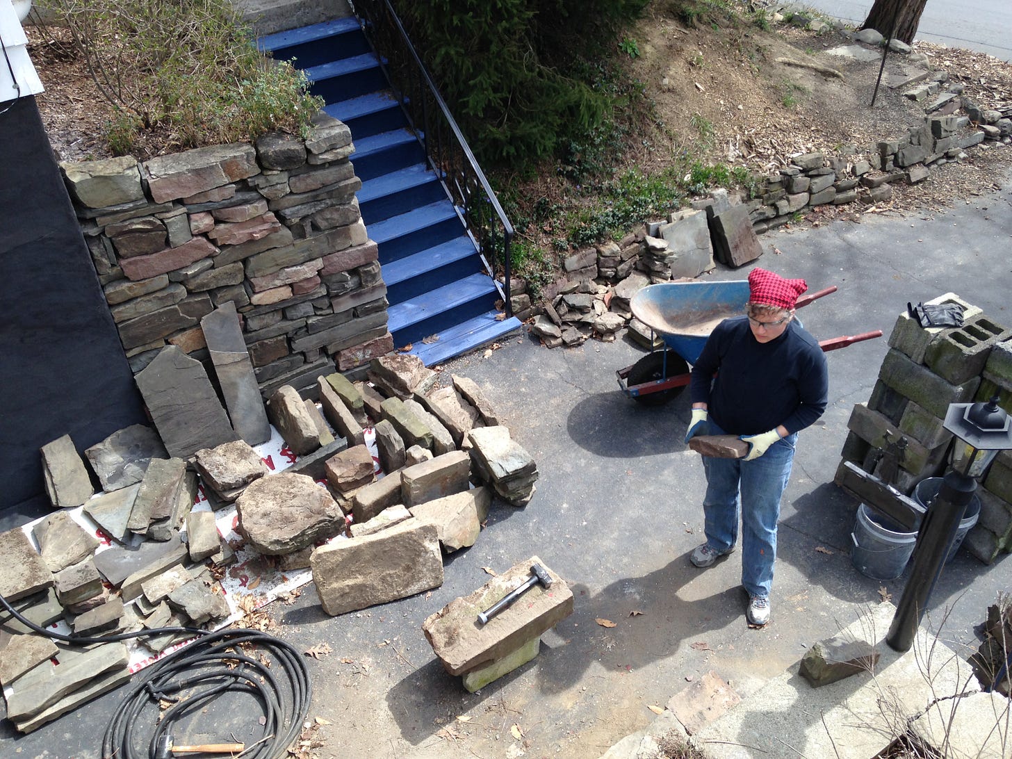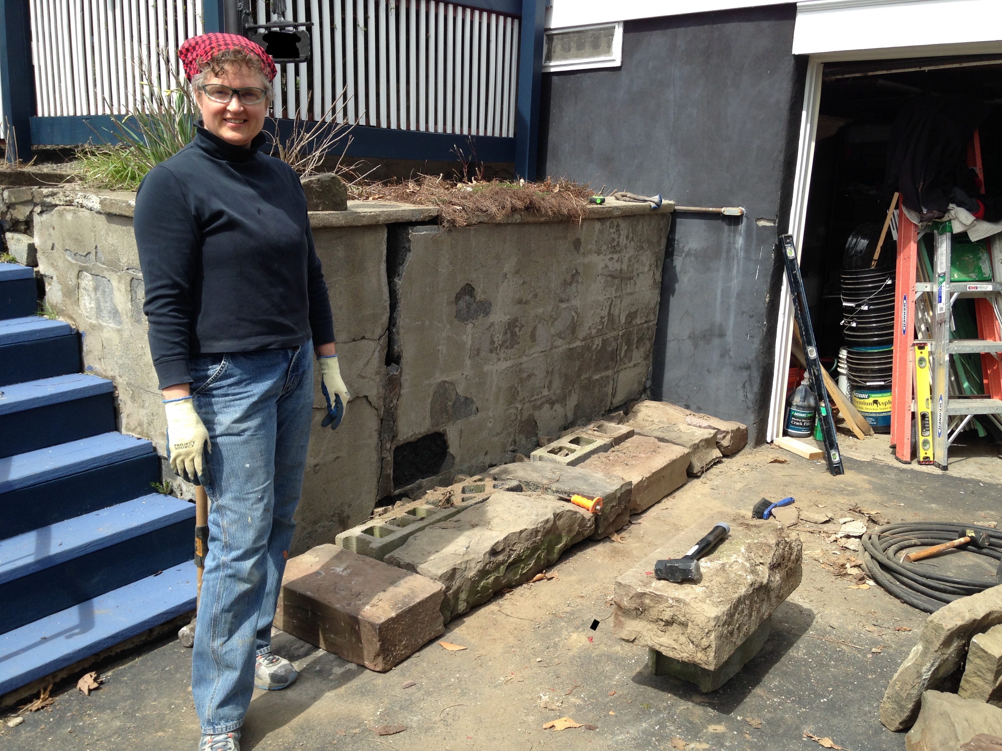 In the first year that we lived in our house, we learned that there was some water seepage through the cinder block foundation in a few places, and undertook excavating by hand (pick and shovel) the dirt adjacent to the exterior of one wall. In the process, we discovered that the cinder block retaining wall was disintegrating, which was the impetus for building our first stone wall. It was a lot of work, but the function and beauty of this wall has rewarded us many times over for our efforts.