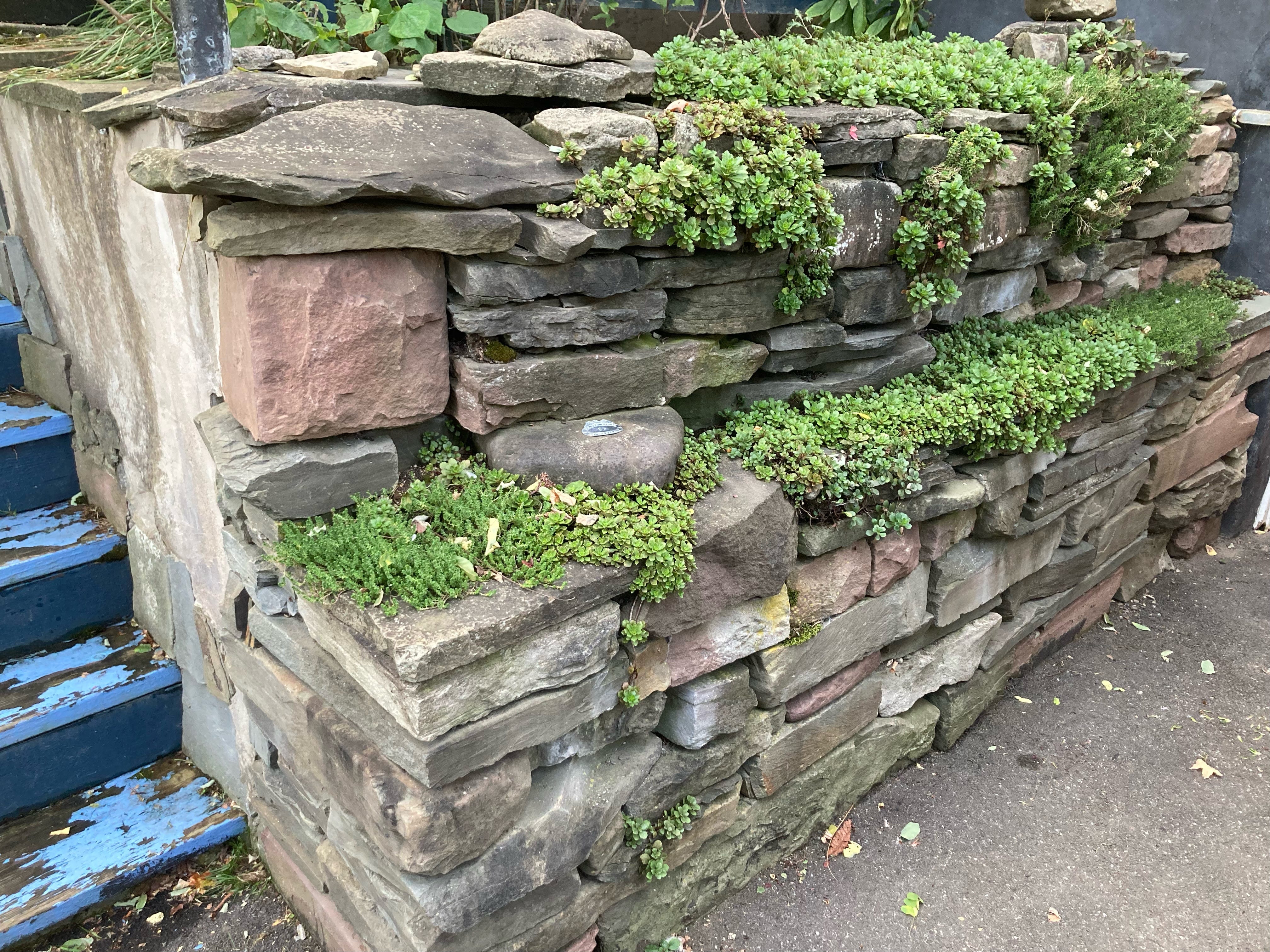 The next wall we built was an elegant and economical solution to another problem. A different retaining wall was failing, and when we got a bid on its repair, the four digit number lead us to reconsider our options. There were still plenty of stones in the hills of our city lot, and so we set to work again. This time I had some creative license at the end of the project, because we needed some cement work to be done next to the steps. Starting with a handful of stonecrop seedlings, the plants covering this wall have transformed it into something beautiful.