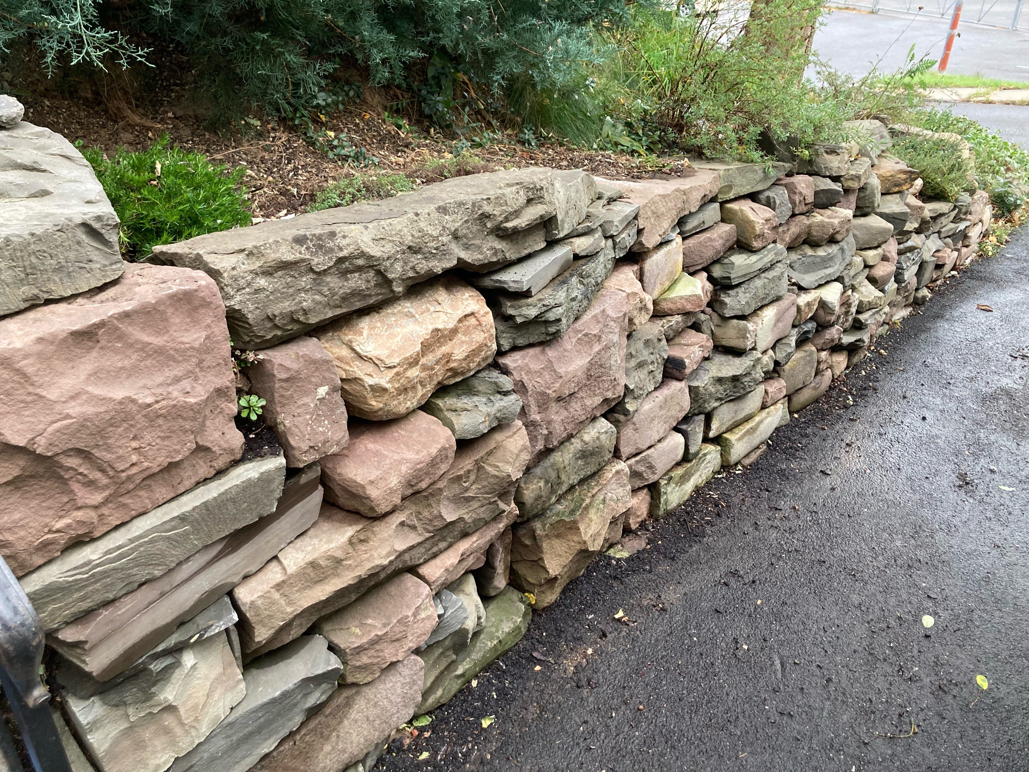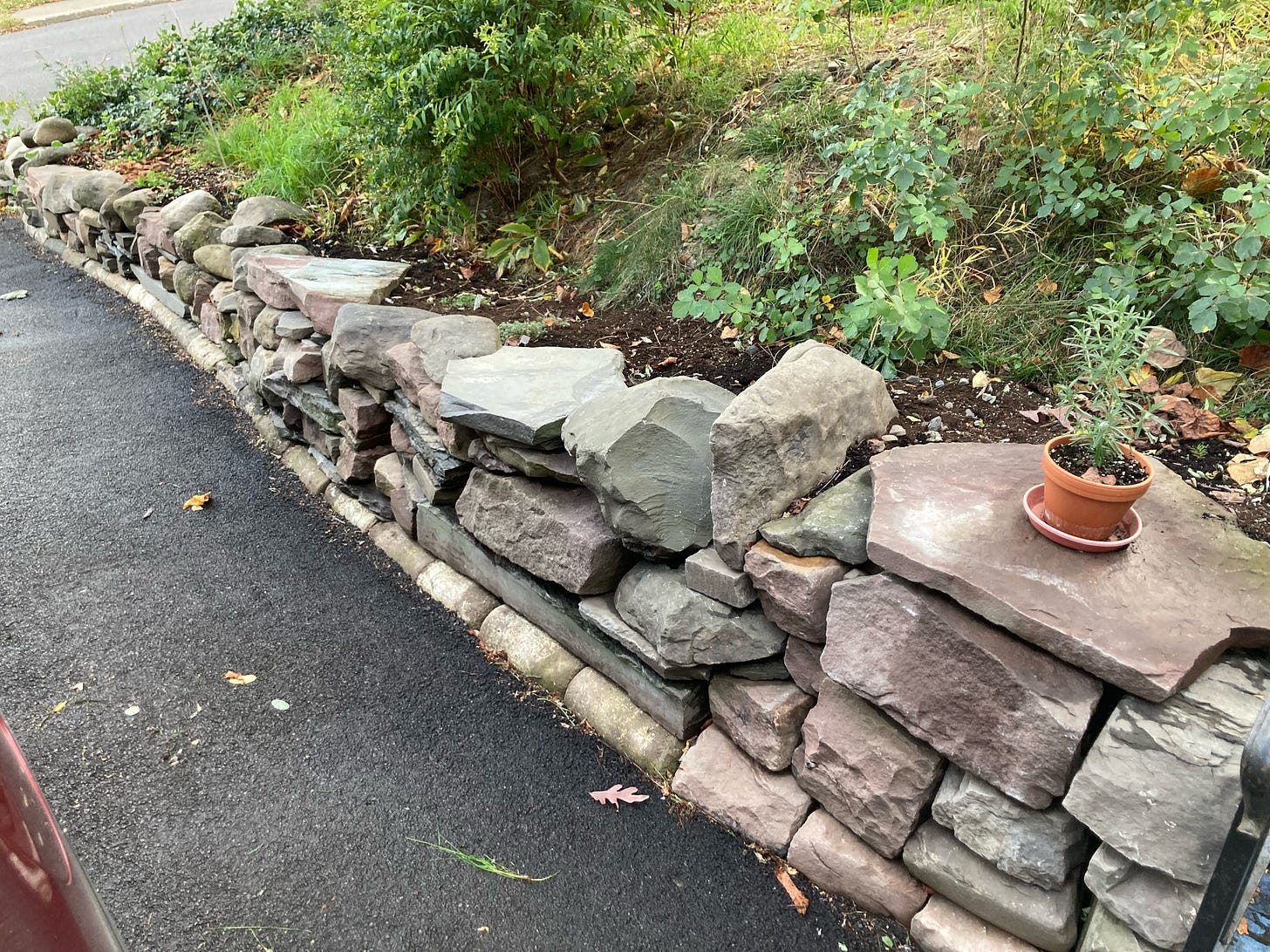 The third wall we built was as much a relationship-building exercise as a way to spend time outside on a regular basis. It involved several months excavating hard clay dirt by pickaxe, shovel and bucket before we could even start laying the foundational stones. The chipmunks love its nooks and crannies, but they are awfully hard on the modest plantings which we have tried. The groundhogs and deer finished off what the chipmunks started, so that it has taken a while to find plants which are well-suited to the soil behind this wall.